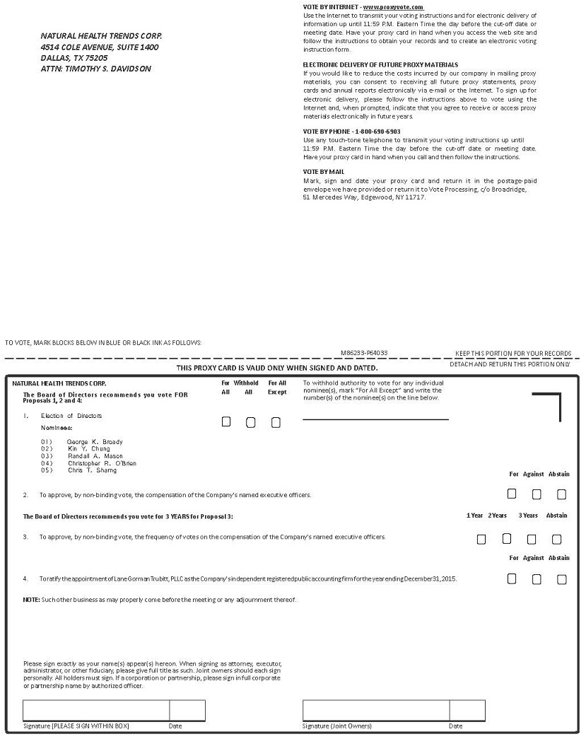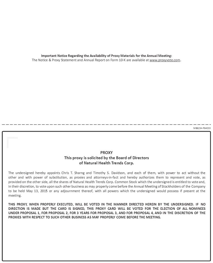 The 2015 annual meeting of stockholders of Natural Health Trends Corp. (the “Company”) will be held on May 13, 2015, beginning at 9:00 a.m. local time, at Terranea Resort, 100 Terranea Way, Rancho Palos Verdes, California 90275. At the meeting, the holders of the Company’s outstanding common stock will act on the following matters: